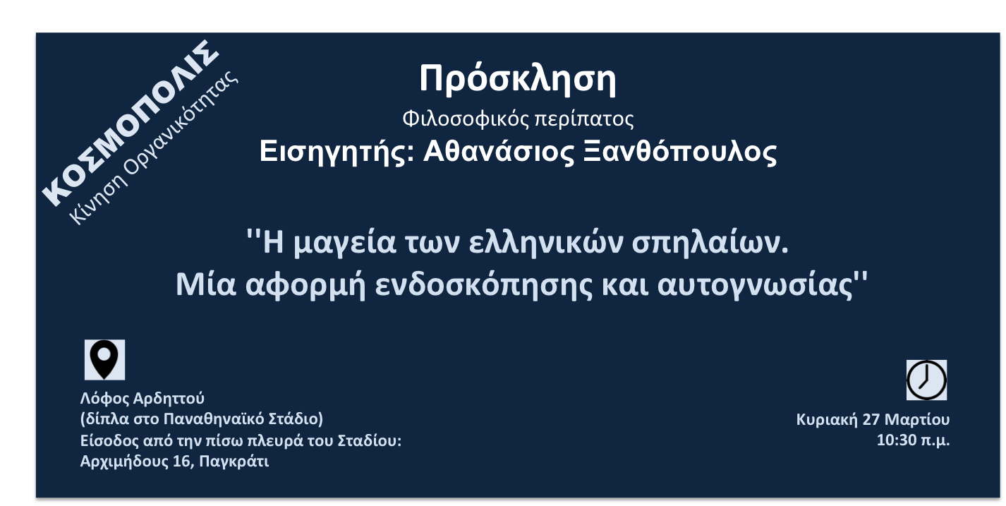 Το θέμα που θα συζητηθεί είναι: «Η μαγεία των Ελληνικών σπηλαίων. Μια αφορμή ενδοσκόπησης κι αυτογνωσίας». Εισηγητής ο Αθανάσιος Ξανθόπουλος.