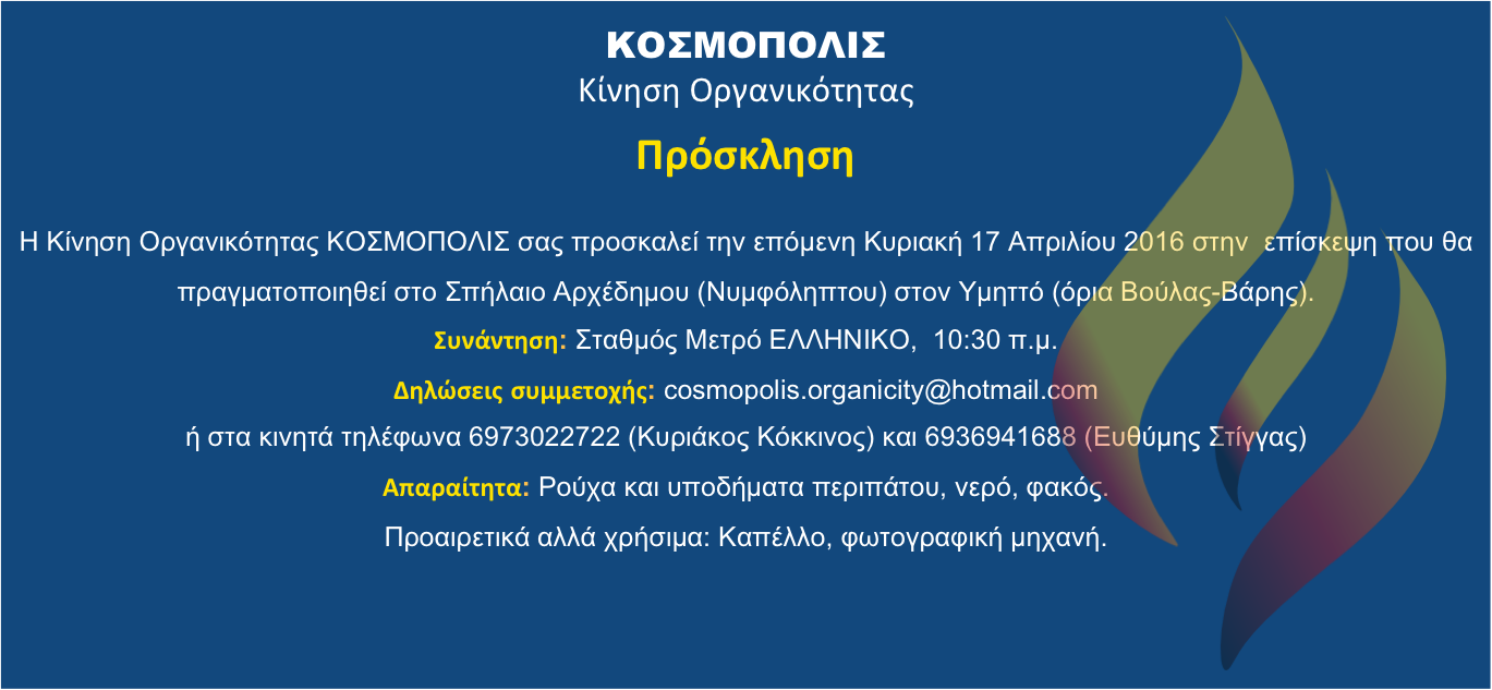 Η Κίνηση Οργανικότητας ΚΟΣΜΟΠΟΛΙΣ συνεχίζει την κοσμική της δράση, οργανώνοντας μηνιαίες, ανοικτές συναντήσεις, με φιλική και φιλοσοφική διάθεση, στις οποίες είστε όλοι καλεσμένοι. Η ενεργοποίηση καθενός από εμάς κι ο συντονισμός όλων μας , στη βάση κοινών αρχών κι αξιών και προς την επίτευξη συλλογικών στόχων, αποτελεί το κρίσιμο διακύβευμα των ημερών … Γι’ αυτό μην αμελείτε. Η συμμετοχή σας είναι αναγκαία για να σηκώσουμε μαζί τον Κόσμο μας Ψηλά!!!