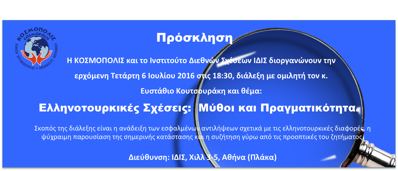 Η Κίνηση Οργανικότητας ΚΟΣΜΟΠΟΛΙΣ σε συνεργασία με το Ινστιτούτο Διεθνών Σχέσεων, διοργανώνει διάλεξη του κ. Ευστάθιου Κουτσουράκη, με τίτλο «Ελληνοτουρκικές Σχέσεις: Μύθοι και Πραγματικότητα».