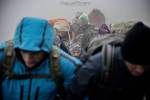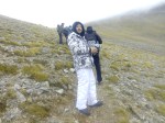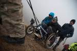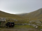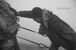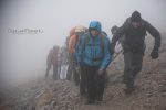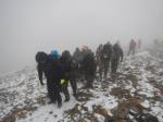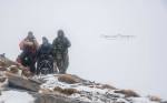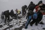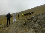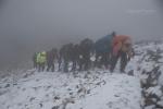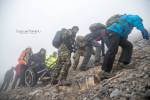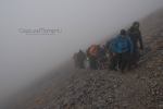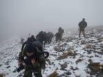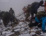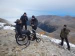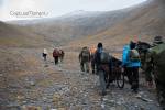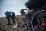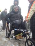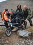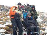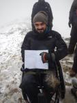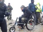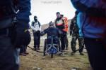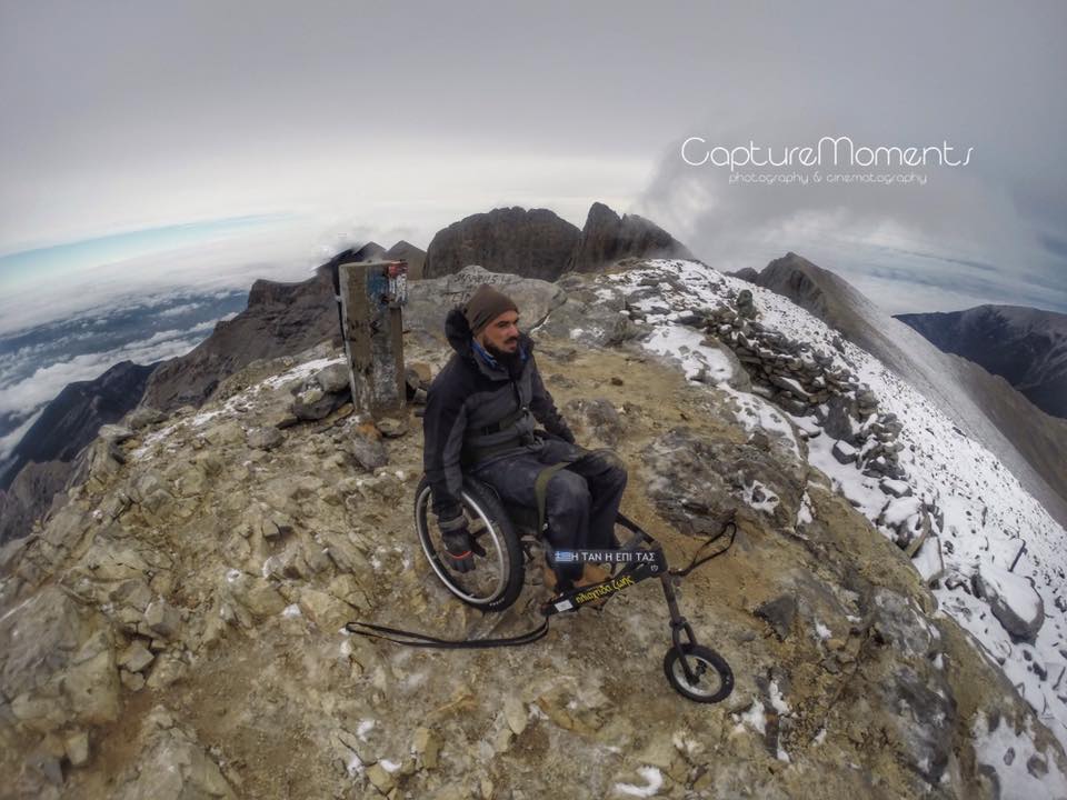 Στο παλιό καταφύγιο διανυκτέρευσε η ομάδα μας και στο νέο η ομάδα των Κυπρίων. Νωρίς το πρωί, 22/10/2016, ετοιμαστήκαμε, ελέγχθηκε ο εξοπλισμός και το ειδικό τρίτροχο αμαξίδιο, που είχε κατασκευαστεί, ώστε να αντέχει στις αντιξοότητες ενός ορειβατικού μονοπατιού, δέθηκαν οι ιμάντες για το τράβηγμα κι ασφάλιση του αμαξιδίου του Γιώργου και ξεκίνησε μία συνταρακτική και συγκλονιστική ομαδική προσπάθεια σώματος, ψυχής και πνεύματος, μέσα στο πρωινό κρύο, ελαφρά χιονισμένο πεδίο, με ομίχλη κι έντονο αέρα. Όλοι μαζί όμως, ως μία οντότητα, ενωθήκαμε στον κοινό πλέον αγώνα, να επιτευχθεί ο στόχος της κατάληψης της «κορυφής», της υπερνίκησης των περιορισμών, του θριάμβου του ανθρώπινου πνεύματος, της ελεύθερης βούλησης, των γνήσιων αρετών, που αναδεικνύονται στην αγώνα για την απελευθέρωση του ανθρώπου από επίκτητους περιορισμούς, αδυναμίες και φοβίες! Πέτρα πέτρα, λακκούβα τη λακκούβα κι ο θρίαμβος μεγάλωνε, καθώς η προσπάθεια μετρούνταν με τα μέτρα ανόδου, που φάνηκαν ατελείωτα κι αυτά αναμετρούσαν τις ανθρώπινες αντοχές. Τα 480 μέτρα υψομετρικής διαφοράς σε ένα ορειβατικό μονοπάτι με μεγάλη κλίση και τον κίνδυνο πτώσης στο βάραθρο, προκαλεί δέος στον κοινό άνθρωπο. Δεν ήταν όμως ικανή συνθήκη να μειώσει το θάρρος, την ακλόνητη θέληση και το πάθος για ζωή του Γιώργου και των αδελφών του, τους οποίους καθόλου δεν ξεχωρίζω, γιατί είναι και δικός τους θρίαμβος η «κορφή», καθώς συνέχισαν μέχρι εκεί τραγουδώντας παρέα το «Πότε θα κάνει ξαστεριά», μέχρι που πάτησαν το πρώτο διάσελο… μέσα στο λυσσασμένο παγωμένο αγέρα! Πόσο η εικόνα μου έφερε στη μνήμη ηρωικές ιστορικές στιγμές του γένους μας, τόσο πολύ επίκαιρες, λόγω του επικείμενου εορτασμού της 28ης Οκτωβρίου σε ανάμνηση του έπους της Πίνδου!
