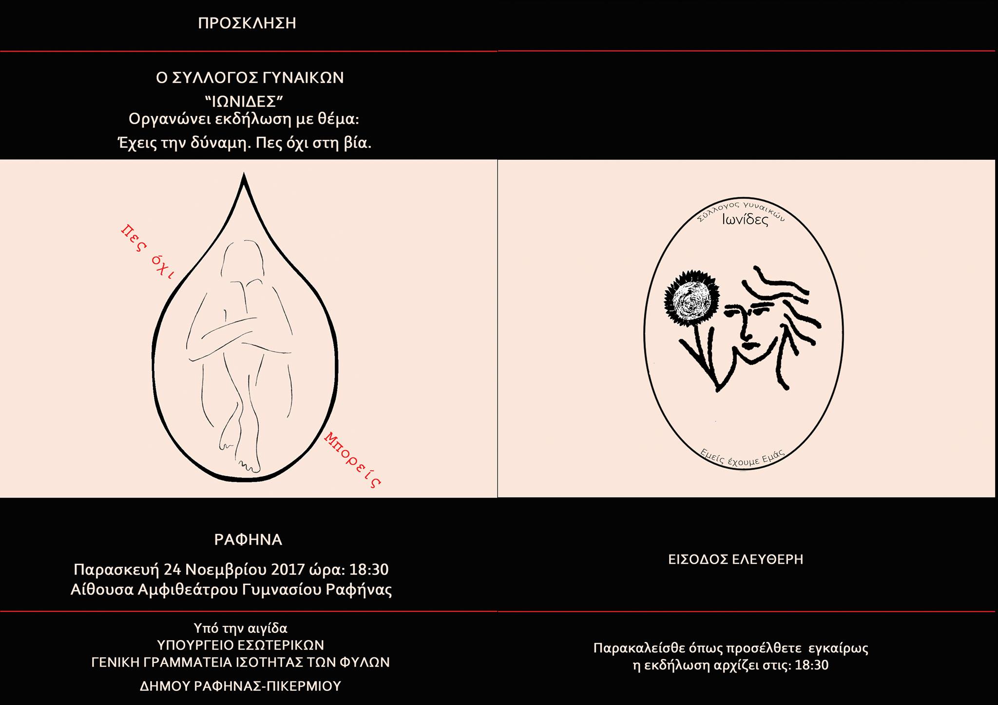 Ο Σύλλογος Γυναικών ΙΩΝΙΔΕΣ οργανώνει εκδήλωση με αφορμή την Παγκόσμια Ημέρα εξάλειψης της βίας κατά των Γυναικών, την Παρασκευή, 24/11/2017, στις 18.30, στο Αμφιθέατρο του Γυμνασίου Ραφήνας, με τίτλο: «Έχεις τη Δύναμη. Πες όχι στη Βία».