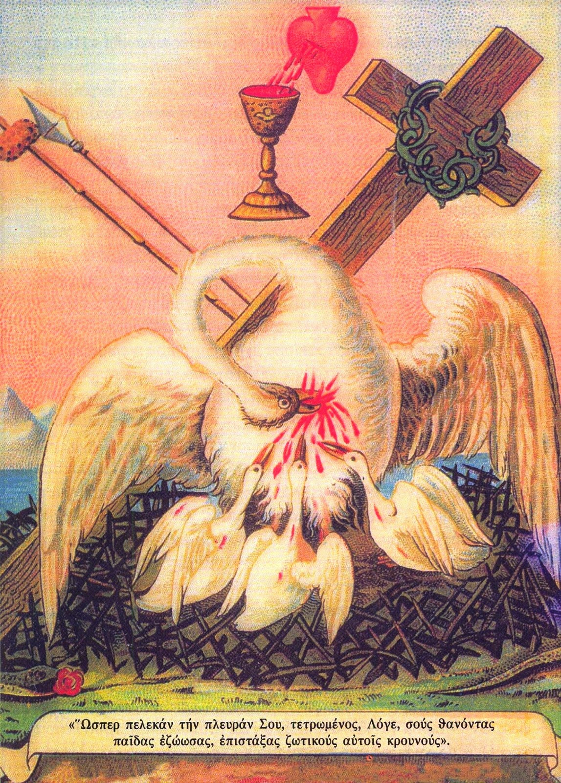 Σχίζει με το ράμφος το στήθος του , στάζει με το ράμφος του από το αίμα του στα ανοιχτά στόματα των μικρών του, που ανεπίγνωστα για τον κίνδυνο που διέτρεχαν, υπέστησαν τη δηλητηρίαση εκ του δήγματος του όφεως και αυτά ζωντανεύουν!