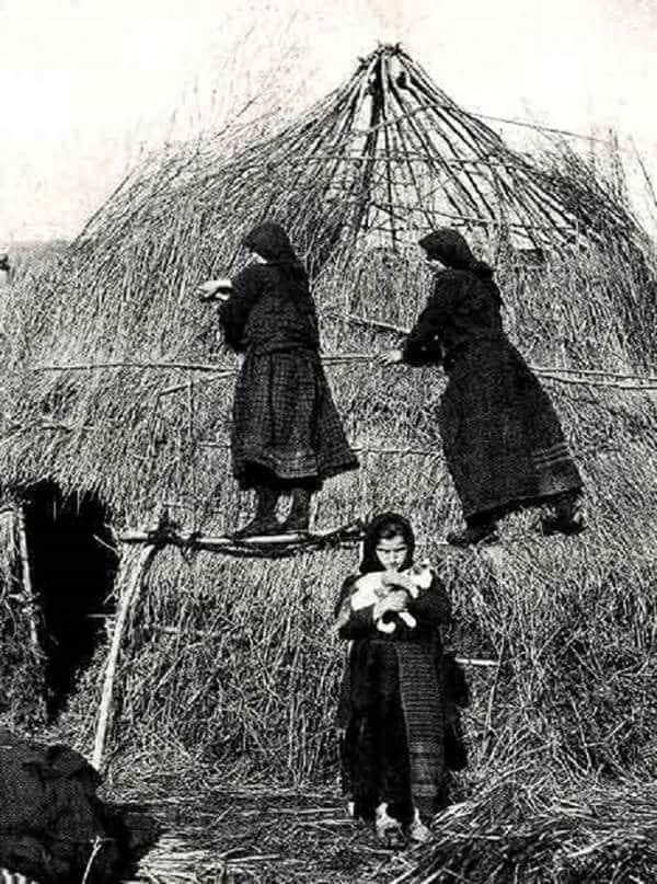 Με το στήσιμο του σκελετού της καλύβας έληγε ο ρόλος του άνδρα. Τον τελειωμό της καλύβας τον αναλάμβαναν οι γυναίκες. Νωρίτερα είχαν πάει στο δάσος, είχαν κόψει με τσεκούρια κατάλληλα ξύλα για τον σκελετό της, και τα μετέφεραν φορτωμένες στην πλάτη. Ξαναπήγαιναν τώρα στο δάσος κι έκοβαν κλαδιά. Τα μετέφεραν πάλι στην πλάτη, έπλεκαν μ’ αυτά τον σκελετό, ετοίμαζαν την καλύβα και τότε την πασάλειβαν με λάσπη απ’ έξω κι από μέσα, για μόνωση. Στο δάσος, όμως, οι γυναίκες θα πηγαίνουν συχνά να κόβουν ξύλα για μαγείρευμα και θέρμανση, και να τα μεταφέρουν πάντα στην πλάτη.