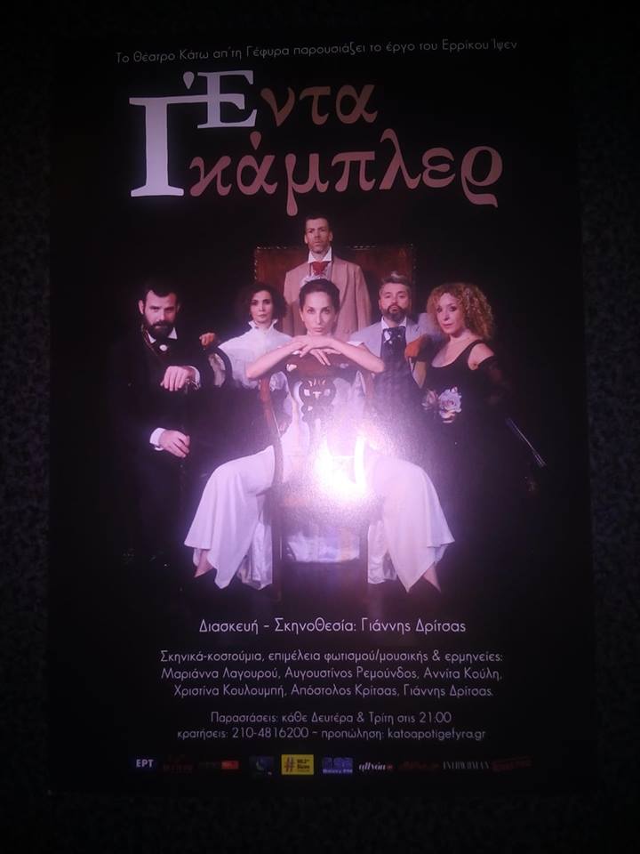 Μία παράσταση σε σκηνοθεσία του φίλου και πολυτάλαντου σκηνοθέτη , ηθοποιού κι ιδρυτικού μέλους της Κίνησης Οργανικότητας Κοσμόπολις Γιάννη Δρίτσα, που αξίζει να δείτε. Έντα Γκάμπλερ, το αριστούργημα του Ίψεν , που αν και γράφτηκε το 1891 και παίχθηκε πρώτη φορά στο Μόναχο, μας θυμίζει τις διαχρονικές ομοιότητες της ζωής των ανθρώπων , την τραγικότητά τους όταν οι ζωές στερούνται νοήματος και ουσίας!