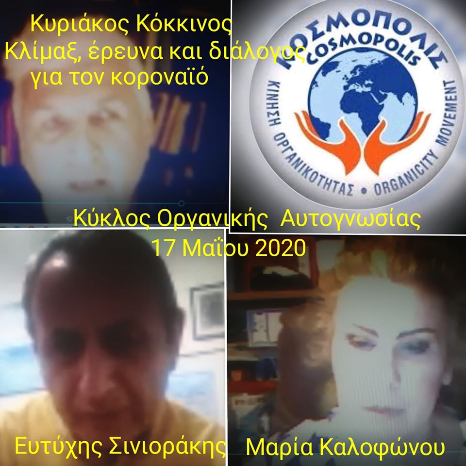 Άλλες δύο μοναδικές συναντήσεις του Κύκλου Οργανικής Αυτογνωσίας της Κίνησης Οργανικότητας ΚΟΣΜΟΠΟΛΙΣ, που διευθύνει διαδικτυακά ο Δικηγόρος, Coach και πρόεδρός της Κυριάκος Κόκκινος, ολοκληρώθηκαν τις Κυριακές, 10 και 17 Μαΐου 2020, αφιερωμένες στους 3 πρώτους αναβαθμούς της ΚΛΙΜΑΚΑΣ του Αγίου Ιωάννη Σιναϊτη σε συνδυασμό με την τρέχουσα επικαιρότητα και την έρευνα, που ξεκινήσαμε στο ΚΟΣΜΟΠΟΛΙΣ για τα ζητήματα που αφορούν τον κοροναϊό και το πώς επηρεάζει τις ζωές μας, μετά από πρόταση του Σταύρου Τσογκανή, που αποδεχθήκαμε. Η μελέτη των σχετικών ζητημάτων θα επιχειρηθεί κατά συστημικό και συστηματικό τρόπο, φωτίζοντας όλες τις δυνατές πτυχές του θέματος. Την Κυριακή, 17/5/2020, ξεκινήσαμε με μία σύντομη εισήγηση στις γενικές πτυχές του ζητήματος από τον ίδιο τον προτείνοντα Σταύρο Τσογκανή και κατόπιν ακούσαμε τα όσα είχαν να μοιραστούν μαζί μας, από πλευράς γνώσεων και εμπειρίας, αλλά και ως άνθρωποι που ζουν με τα αυτά προβλήματα, ενδιαφέροντα και ανάγκες όπως όλοι μας, εκλεκτοί επαγγελματίες του χώρου της υγείας της πρώτης γραμμής σε νοσοκομεία αναφοράς για τον κοροναϊό και συγκεκριμένα: