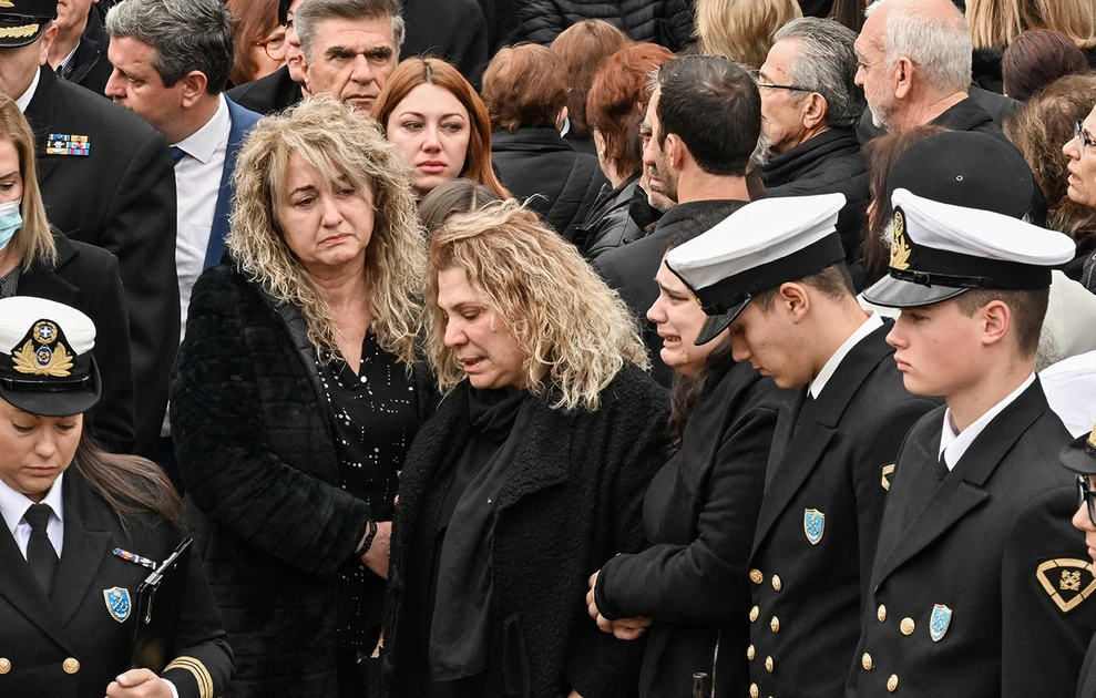 Τραγική φιγούρα η σύζυγος του λιμενικού, η οποία λύγισε και ξέσπασε σε κλάματα αγκαλιάζοντας το φέρετρο του αδικοχαμένου συζύγου της, το οποίο ήταν τυλιγμένο με την ελληνική σημαία.