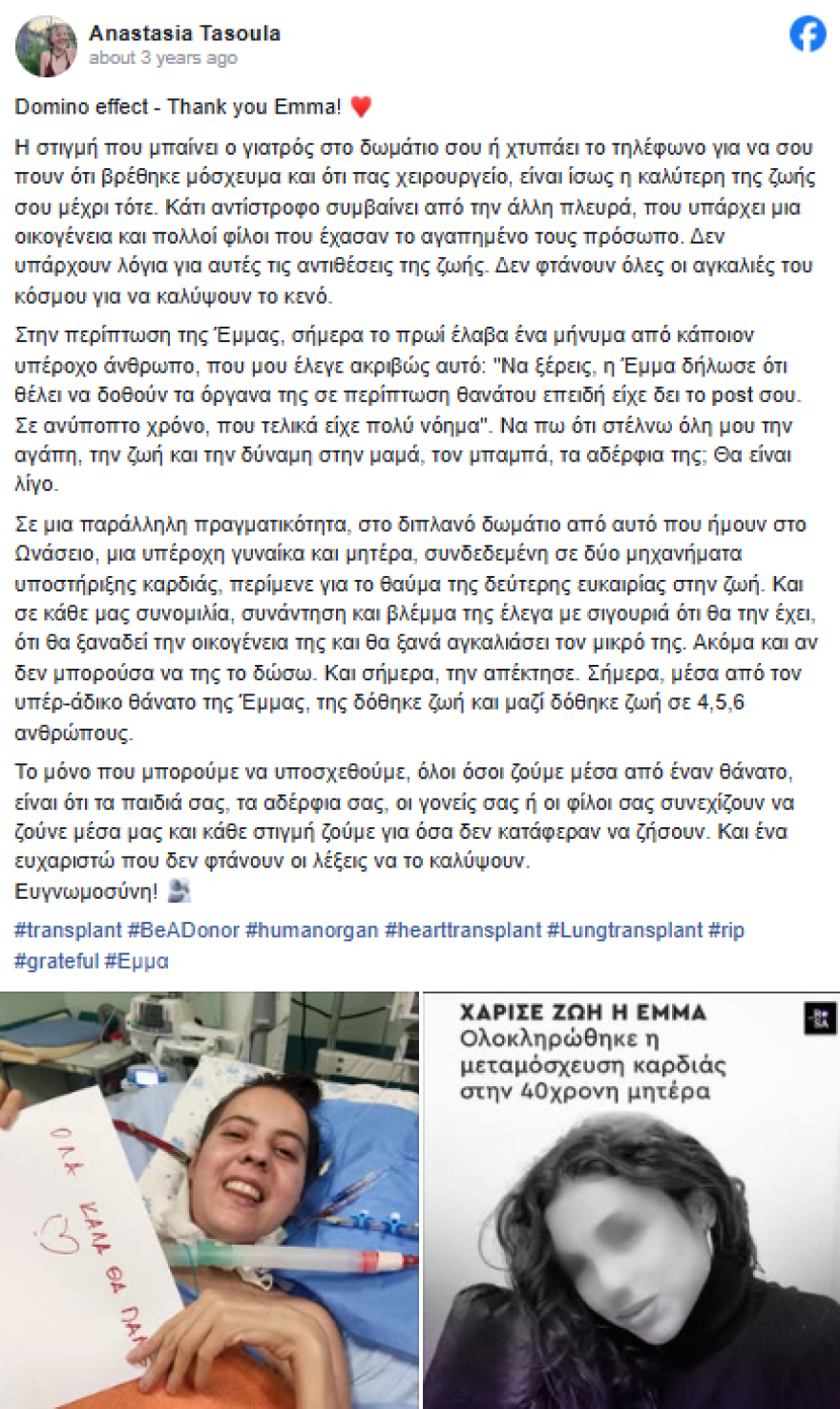 Η Αναστασία είχε αποκαλύψει πως η Έμμα Καρυωτάκη, η 21χρονη Χανιώτισσα που είχε σκοτωθεί σε τροχαίο στη Θεσσαλονίκη, είχε αποφασίσει να δωρίσει τα όργανά της μετά την ανάρτηση που είχε κάνει η ίδια. Έγραφε τότε η Αναστασία: