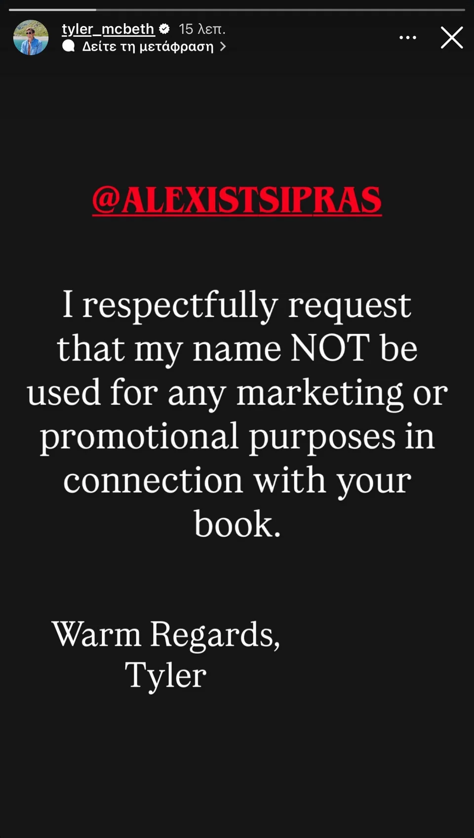 Με ένα story στο Instagram, ο Τάιλερ Μακμπέθ απευθύνεται στον Αλέξη Τσίπρα γράφοντάς του: «Ζητώ με σεβασμό το όνομά μου να ΜΗ χρησιμοποιείται για οποιονδήποτε σκοπό σκοπό διαφήμισης ή προώθησης σε σχέση με το βιβλίο σας».