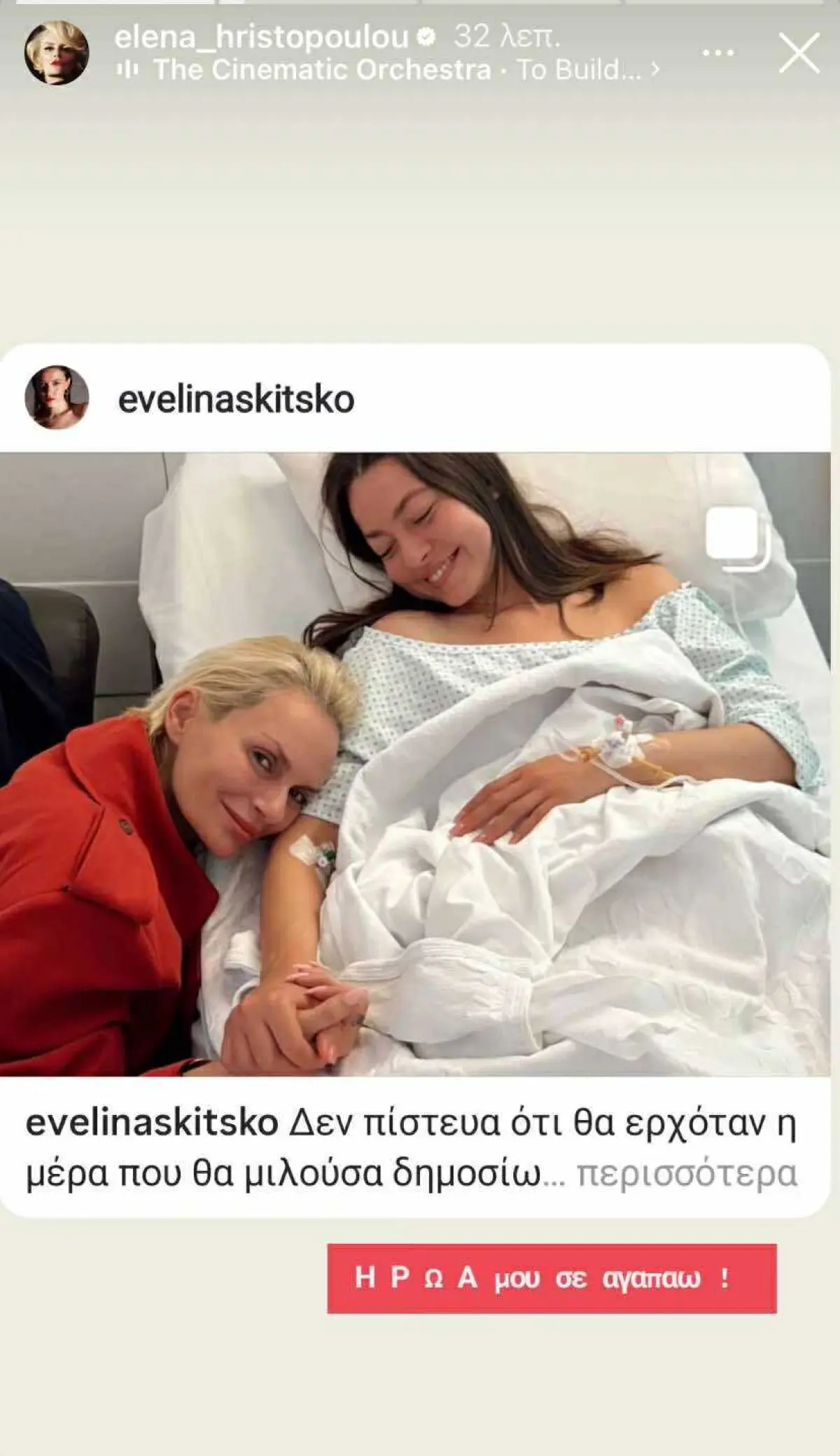 Η Έλενα Χριστοπούλου, η οποία είναι δίπλα στην πρώην παίκτρια του GNTM από την στιγμή αυτού του δύσκολου αγώνα, θέλησε να δείξει την συμπαράστασή της με μια ανάρτηση στο story της όπου μοιράστηκε μια φωτογραφία από την επίσκεψή της στο νοσοκομείο, γράφοντας: «Ήρωα μου σε αγαπώ»